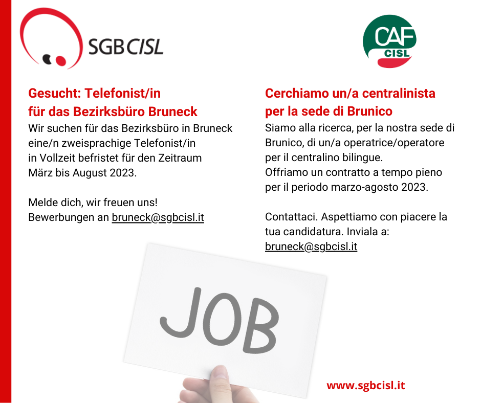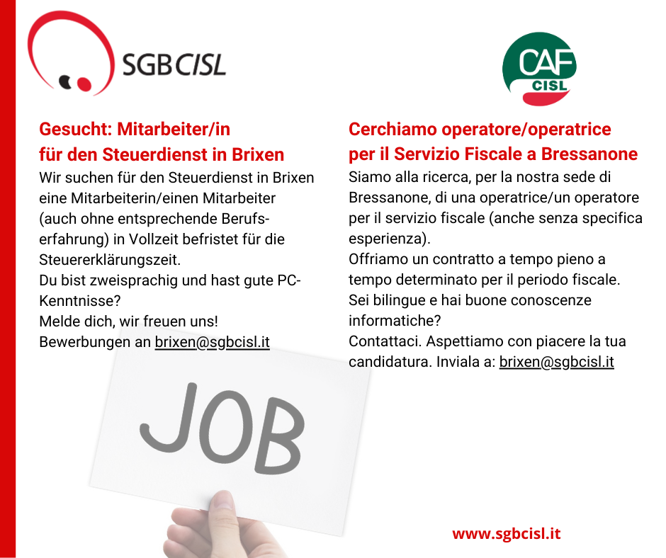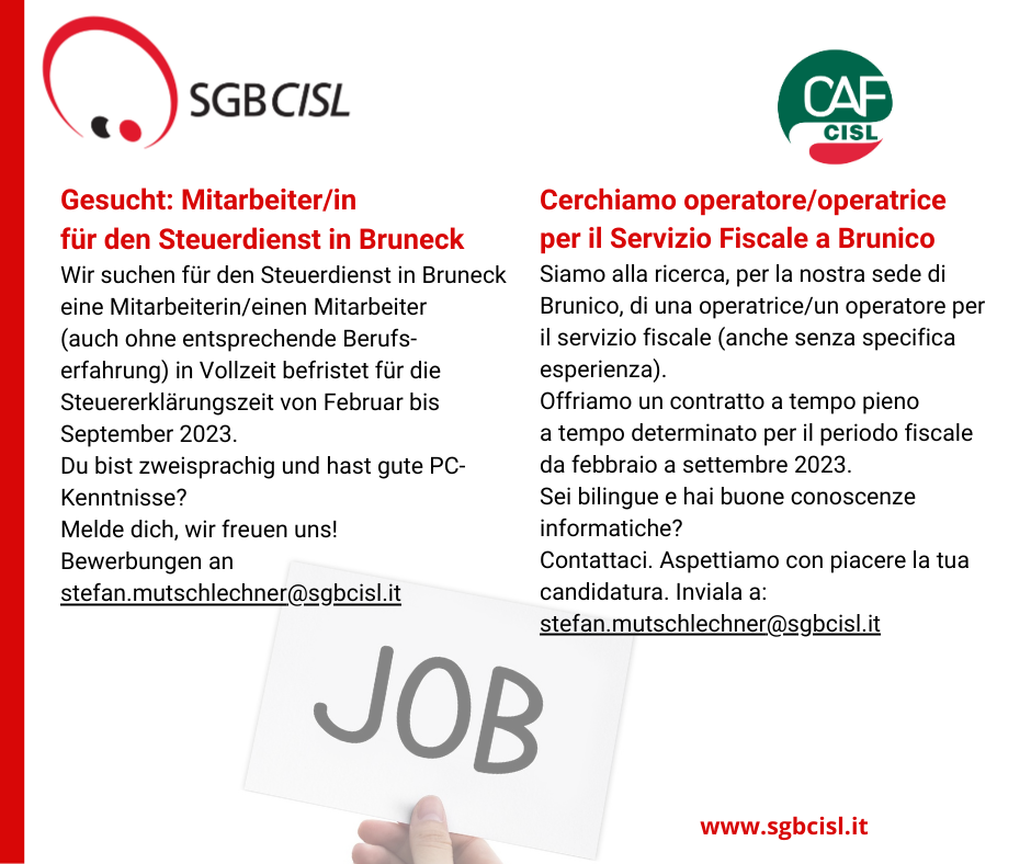 Der Steuerdienst sucht Mitarbeiter/innen in Brixen und Bruneck befristet für die Steuererklärungszeit. Mehr Infos dazu in den Info-Posts.