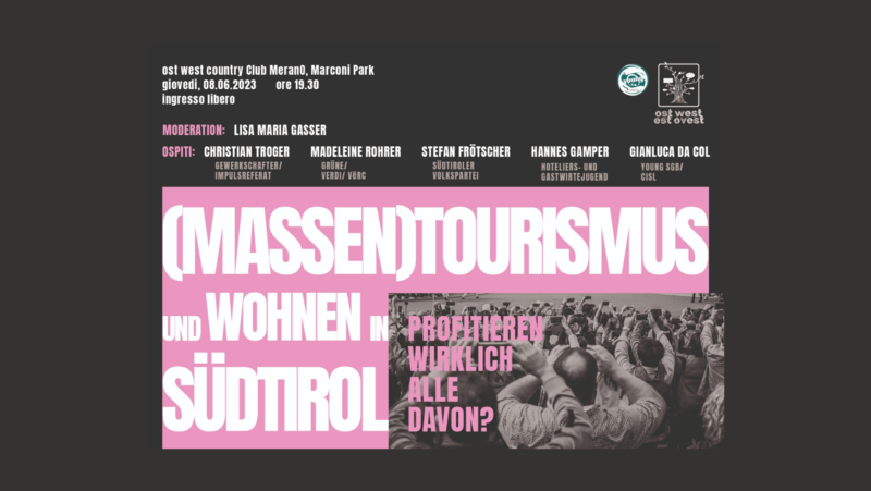 Am 8. Juni hat im Ost West Club Est Ovest eine Podiumsdiskussion zu den überaus aktuellen Themen Massentourismus und Wohnen in Südtirol stattgefunden. Der Landeskoordinator der YOUNG SGBCISL, Gianluca Da Col hat gemeinsam mit Stefan Frötscher (SVP Meran), Madeleine Rohrer (Verdi Grüne Vërc) und Hannes Gamper (HGJ) unter anderem über die Konsequenzen und Auswirkungen der stätig wachsenden touristischen Ankünfte und Übernachtungen auf die Arbeitswelt, den Wohnungsmarkt und den Verkehr in Südtirol debattiert.