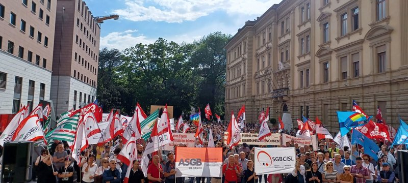 Centinaia e centinaia di lavoratori, pensionati e cittadini provenienti da tutta la Provincia hanno risposto all’appello lanciato dai Sindacati ASGB, CGIL/AGB, SGBCISL e UIL-SGK partecipando alla manifestazione “Non basta” del 6 giugno in Piazza Magnago a Bolzano per chiedere, a fronte di inflazione e caroprezzi, retribuzioni più alte e la tutela del potere d’acquisto di salari e pensioni.